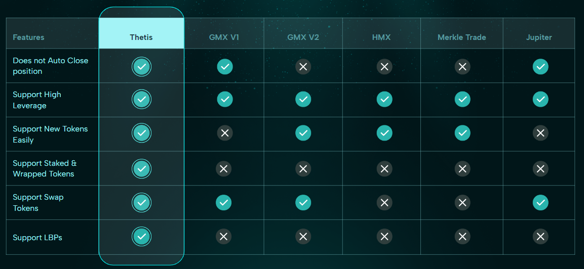 2. **Perpetual Trading DEX**: Unlike traditional perpetual trading platforms that use synthetic models, Thetis allows for unlimited profit per trade without auto-closing positions. Our isolated liquidity pool model enables easy addition of new tokens and supports advanced trading features.